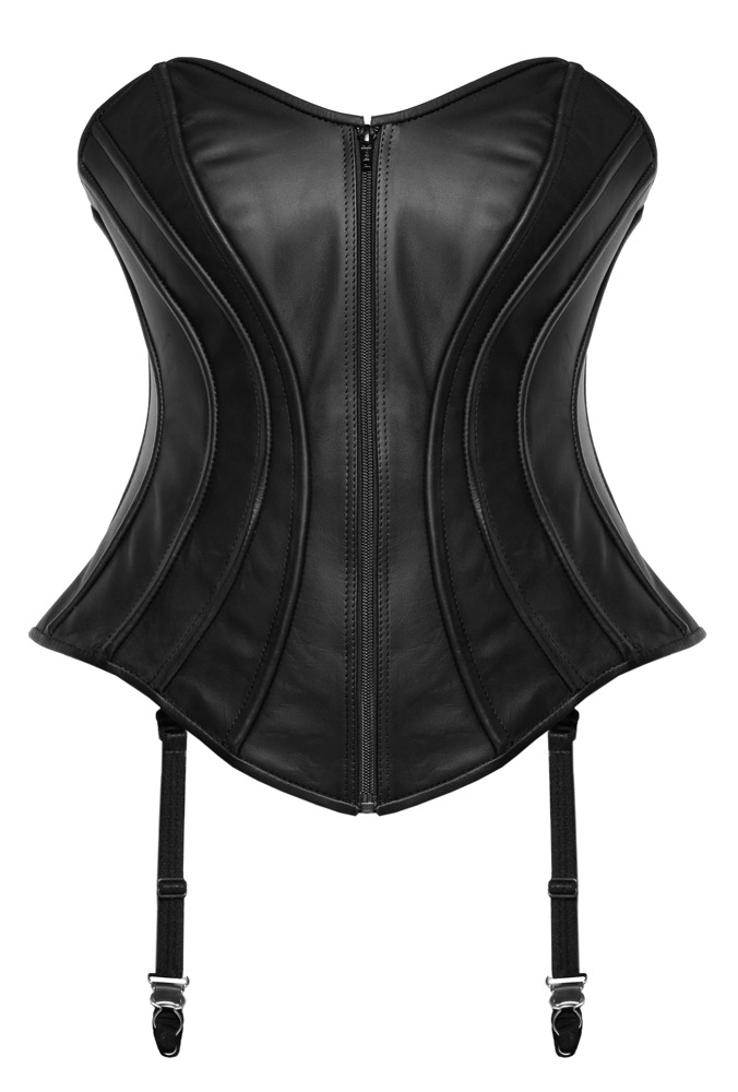 Trägerloses Vollbrust-Korsett von ZADO aus feinem weichem Lammnappa. Eingearbeitete Formstäbe und die offene variable Schnürung im Rücken bringen Busen und Taille in kurvige Form. Vorne mit durchgehendem Reißverschluss für bequemes An- und Auskleiden. Die verstellbaren Strumpfhalter sind vom Korsett abnehmbar.