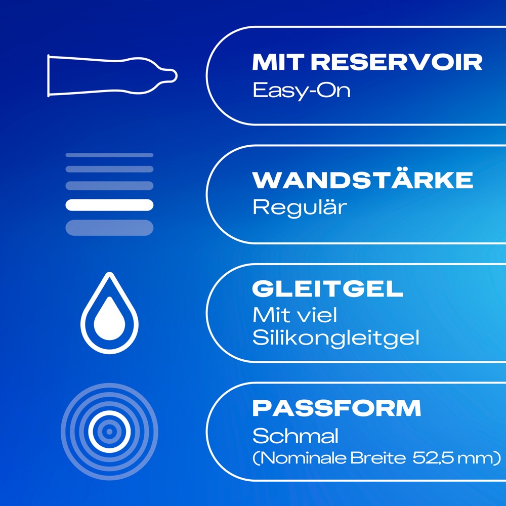 Transparentes, anatomisch geformtes Kondom mit Easy-on Passform für perfekten Sitz und leichteres Abrollen. Das spezielle Herstellungsverfahren verleiht außerdem einen angenehmen Duft. Extrafeucht mit Reservoir. Dermatologisch getestet.