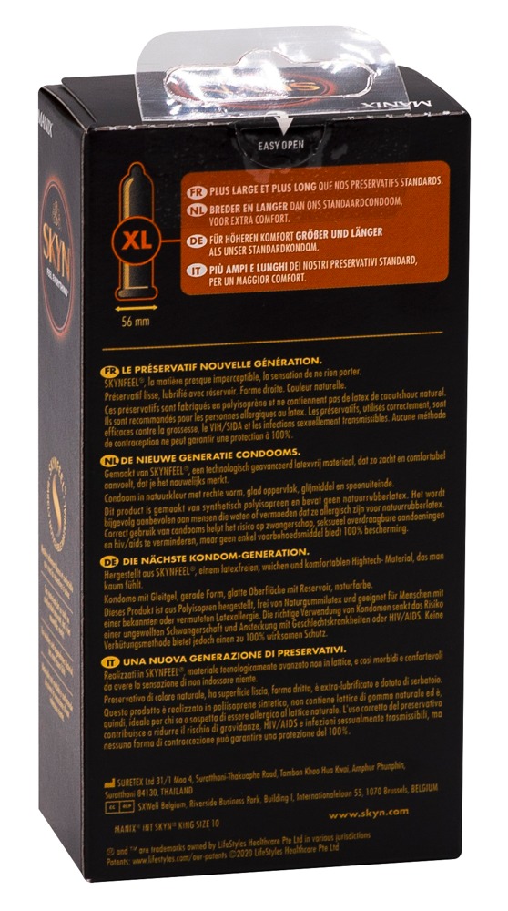 Die transparenten, feuchten, ultradünnen Kondome Manix SKYN King Size sind extra groß mit einer Länge von 190 mm (üblich sind 180 mm) und einer nominalen Breite von 56 mm (üblich sind 52 mm). Das Polyisopren-Material der Kondome wird Skynfeel genannt und ist weicher und elastischer als Latex, dabei aber genauso stabil und kommt ohne den klassischen Latexgeruch aus. Es ist somit ideal für Latexallergiker geeignet. Vegan.