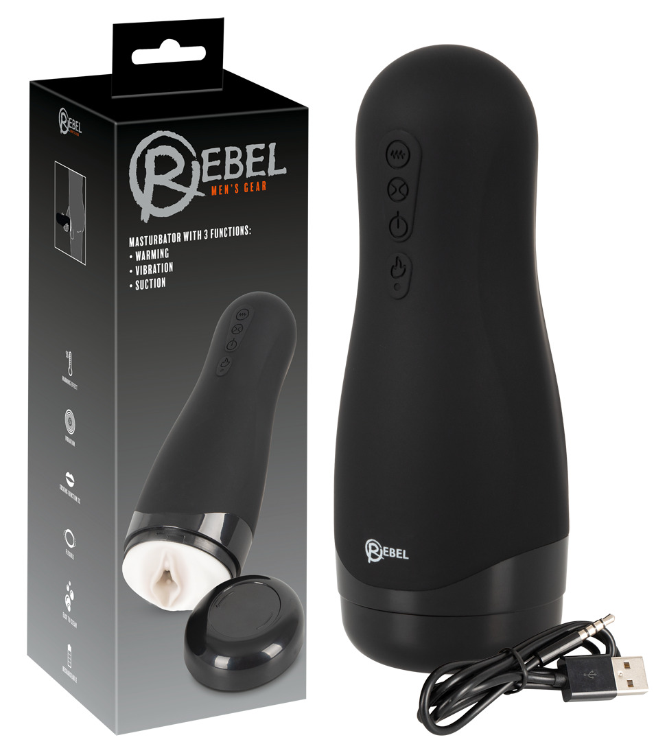 Handlicher Masturbator with 3 Functions von Rebel mit aufregend genoppter Soft-Sleeve in Vagina-Optik im Inneren. Dazu eine Wärmefunktion bis 42°C, abwechslungsreiche 5 Vibrationsmodi in 3 Geschwindigkeiten und eine intensive Saugfunktion in 3 Modi. Alle Funktionen sind separat und bequem per Knopfdruck direkt am Toy steuerbar. Das hochwertige Silikonmaterial sorgt beim Masturbieren für ein sehr angenehmes Hautgefühl. Die Soft-Sleeve ist zur einfachen Reinigung herausnehmbar. Der Masturbator lässt sich (staub)sicher und diskret mit der beiliegenden Schutzkappe verwahren. Wiederaufladbar – inkl. USB-Ladekabel.