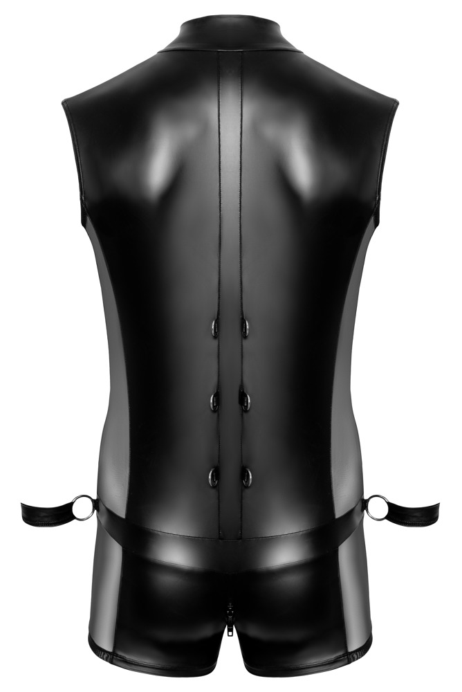 Ärmelloser Overall mit 2 Handfesseln im Set von Svenjoyment BONDAGE. Der edle schwarze Mattlook schmiegt sich hautnah an. Mit Netzeinsätzen am kurzen Bein für aufregende Einblicke. Vorne Reißverschluss vom Stehkragen bis zum Hüftbund. Im Beutel mit unterlegtem Reißverschluss. Am Hüftbund jeweils seitlich ein Ring, durch die die beiden beiliegenden Handfesseln durchgezogen werden können. Mit ihren verstellbaren Klettverschlüssen sind die soften Fesseln für lustvolle Fixierungen schnell angelegt. Im unteren Rücken 6 Ringe für weitere Fesselungsmöglichkeiten.