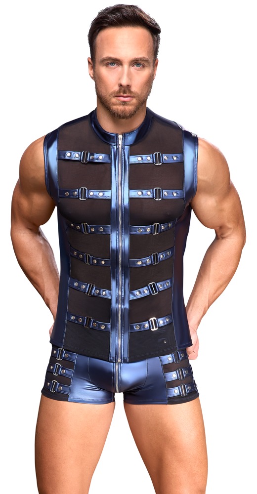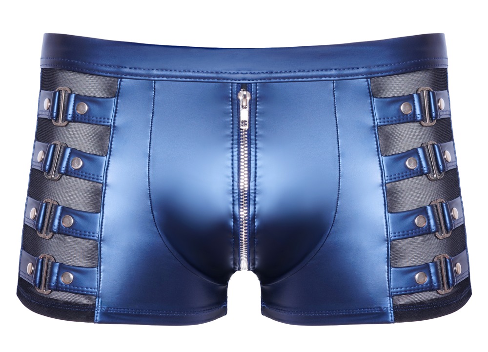 Enge betonende Pants von NEK mit unterlegtem Reißverschluss im Beutel. Im coolen blauen Metallic-Mattlook mit nietenbesetzten Riemen an den Seiten. Unter den Riemen schwarz-transparente Powernet-Einsätze. Weich, elastisch und mit bezogenem Bundgummi für maximalen Tragekomfort.