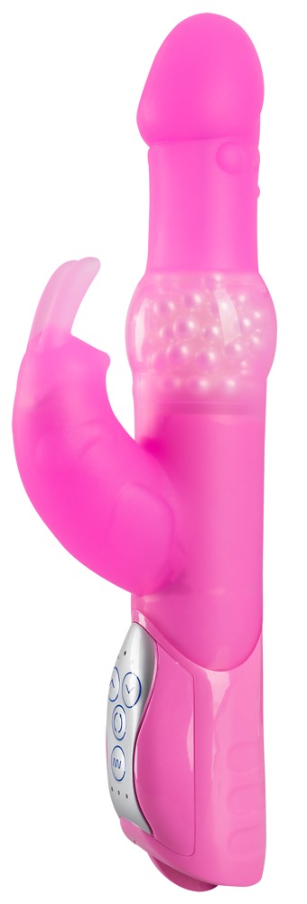 Silikon-Vibrator mit Klitoris-Vibro-Bunny und beweglichen Ohren. Die Links-Rechts-Rotation ist in jeweils 3 Stufen, die Vibration in 7 Stufen bequem per Knopfdruck regelbar. Pink. Gesamtlänge: ca. 26 cm. Einführtiefe ca. 13 cm. Ø 3,1-4,4 cm. Material: Silikon, ABS. (Batterien bitte extra bestellen: 3 x Mignon/AA)