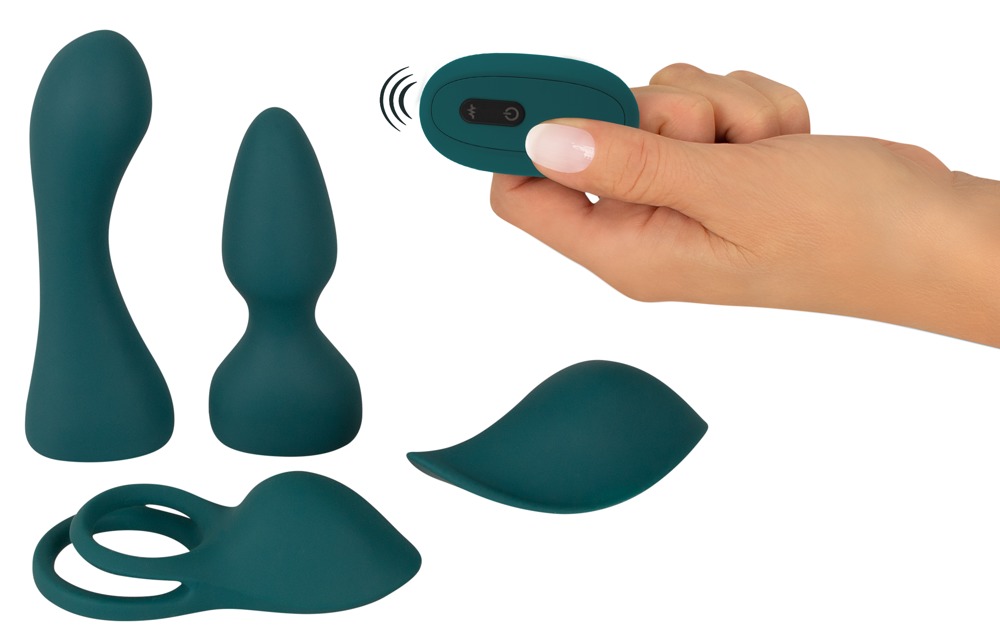 5-teiliges Toy-Set RC Mini Vibrator with 4 Attachments von Coup!es Choice bestehend aus G-Punkt-Dildo, Analplug, Auflege-Stimulator, Penis-/Hodenring mit Klitoris-Stimulator und Vibrobullet, das in jedes der 4 Toys eingesetzt werden kann. Die Vibrationen sind mit der beiliegenden Fernbedienung bequem steuerbar. Ein erlebnisreiches Fun-Set für vielseitige Spiele an und im Körper – allein oder zu zweit!