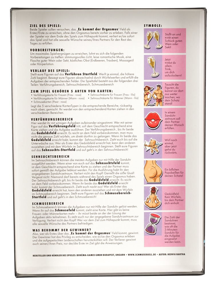Dieses verführerische Brettspiel ist ideal für alle Frischverliebten oder auch für Paare, die sich neu entdecken möchten. Es beginnt mit einfachen, aufwärmenden Aufgaben, die im Laufe des Spiels immer heißer werden und letztlich im Liebesakt enden. Ein steigendes sexuelles Verlangen ist garantiert – aber Vorsicht: Der Orgasmus darf bis zum Spielende von keinem der Spieler erreicht werden! Kommt einer zu früh, muss dieser alle sexuellen Wünsche des Partners erfüllen.