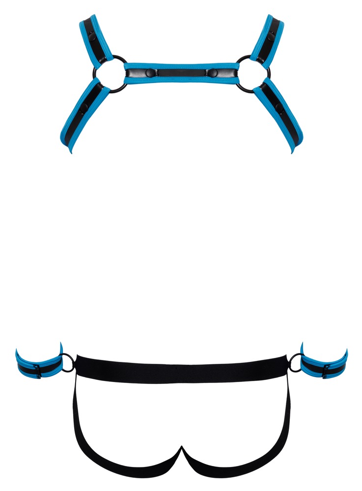 Brustharness, Jock und 2 Handfesseln im Set von Svenjoyment BONDAGE. Extravagante Neopren-Optik in Schwarz mit royalblauen Kontrasten. Harness mit Druckknöpfen schnell an- und abgelegt. Pofreier Jock mit unterlegtem Reißverschluss im Beutel. Am Bund jeweils seitlich ein Ring für die beiliegenden Handfesseln mit verstellbaren Klettverschlüssen.