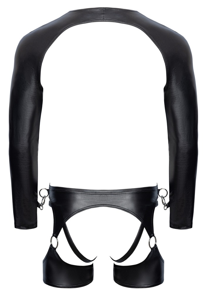 3-teiliges Set von Svenjoyment Bondage mit Bolero, Hüftharness und Jock. Alles im angesagten schwarzen Mattlook – weich und elastisch für vollen Tragekomfort. Mit vielen silberfarbenen Ringen sowie Karabinern an den Ärmeln für vielseitige Light-Bondage-Spiele.