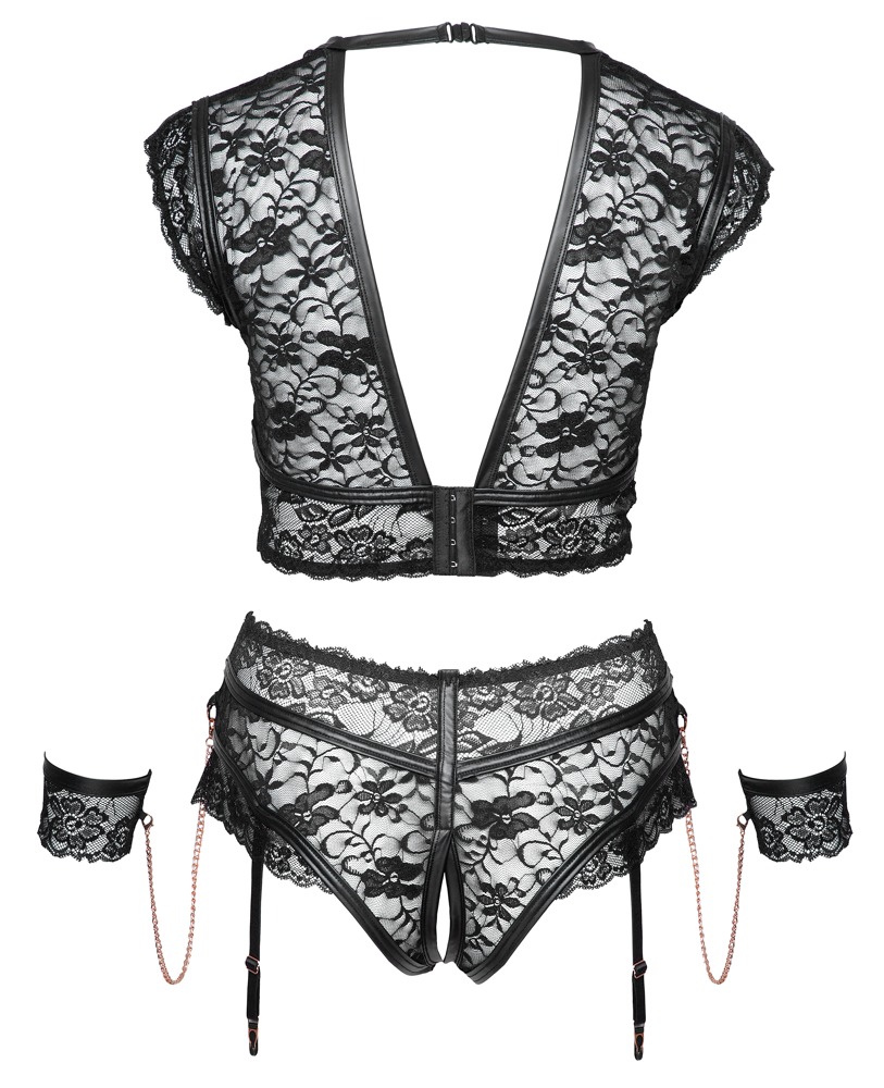 BH und Straps-Slip ouvert von Cottelli BONDAGE aus weicher elastischer Spitze mit Mattlook-Streifen und roségoldfarbenen Elementen. Für fesselnde Lustmomente sorgen die Spitzen-Handfesseln, die mit Karabinerketten an den seitlichen Ringen des Slips befestigt werden können. Der Soft-BH ist etwas länger geschnitten und im tiefen Ausschnitt vorne mit einem Riemenkreuz aus Stretchbändern versehen. Im Nacken hat der BH einen Clip-, im Rücken einen Hakenverschluss. Der Slip ist im Schritt einladend offen. Die verstellbaren Strapse sind vom Slip abnehmbar.