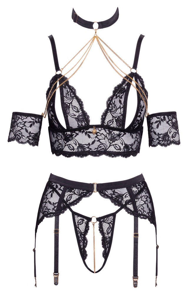 Luxuriöses Straps-Set von Abierta Fina mit BH-Top, Strapsgürtel und String ouvert inklusive Spitzen-Armstulpen und Halsband. Feine schwarze Blütenspitze verführerisch in Szene gesetzt mit goldfarbenen Accessoires und Ketten. Rundum weich und elastisch für hohen Tragekomfort. BH-Top mit kleinem Herz-Schmuckanhänger zwischen den geschlitzten Soft-Cups. Die Träger und der Hakenverschluss im Rücken sind verstellbar. An die dekorativen Ringe des Tops können die abnehmbaren Karabinerketten des verstellbaren Halsbandes befestigt werden. Auch an den beiliegenden elastischen Spitzen-Armstulpen lassen sich die Ketten befestigen, um Bewegungen sinnlich einzuschränken. Der Strapsgürtel punktet mit jeweils 3 verstellbaren Strumpfhaltern pro Seite. Im Rücken mit Hakenverschluss. Der kleine String verführt mit stimulierender Kette im offenen Schritt, die auch abgenommen werden kann.