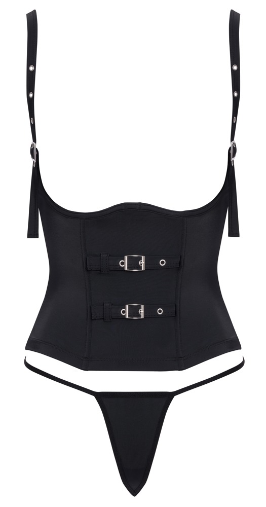 Schwarze Taillen-Corsage von Cottelli PARTY mit seitlichen verstellbaren Schnallenträgern. Mit Cup-Bügeln zur leichten Unterstützung der freiliegenden Brüste. Vorne mit zwei eingearbeiteten Formstäben und 2 dekorativen, verstellbaren Schnallenriemchen. Im Rücken mit Hakenverschluss. Solo getragen ein sinnlicher Eyecatcher. Mit Shirt oder Bluse darunter getragen, eine stilvolle Corsage für kurvenbetonende Styles. Rundum weich und elastisch anschmiegsam für maximalen Tragekomfort. Der dazu passende Mini-String ist inklusive!