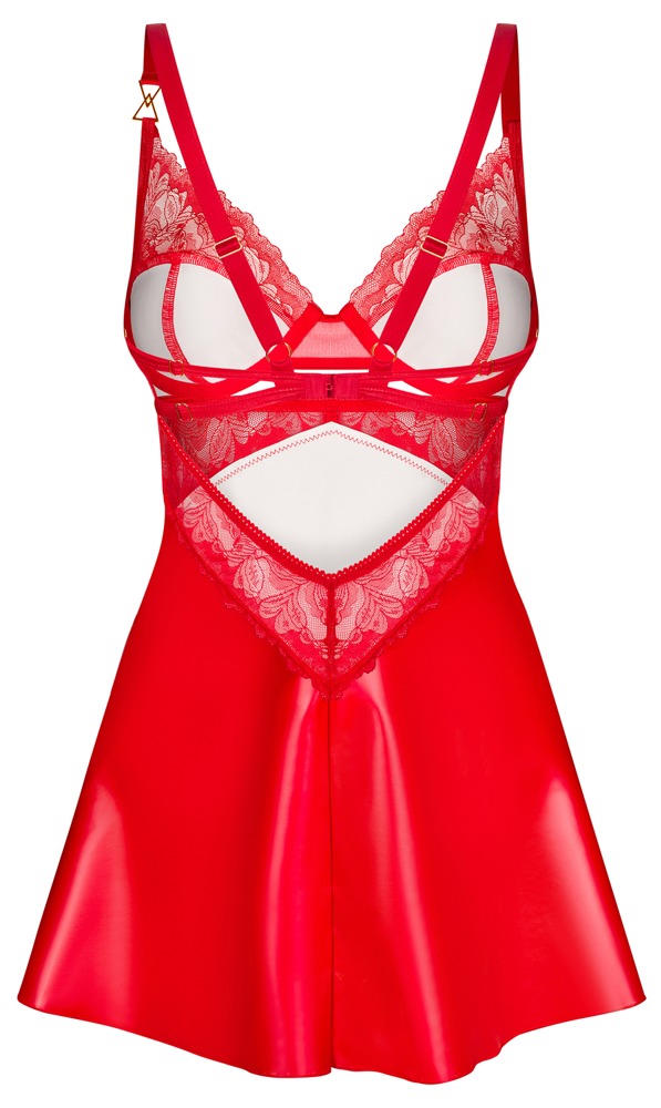 Set Aliosa von Obsessive mit kurzem ausgestellten Negligé und String. Verführerischer Style in sinnlichem Rot mit edlem glattem Glanz und feiner transparenter Floral-Spitze. Rundum weich und elastisch für hohen Tragekomfort. Negligé mit dezentem goldfarbenem Schmuckdetail zwischen den Bügel-Cups und an einem Träger. Die Träger und der Hakenverschluss im Rücken sind passend verstellbar.