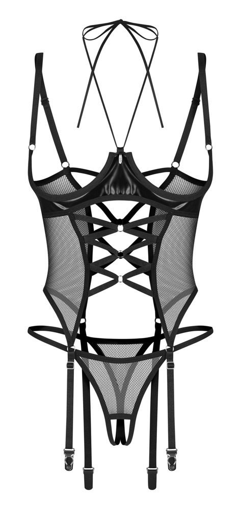 Busenfreies Strapshemd Dominna von Obsessive inklusive String ouvert. Im stylischen Mix aus weichem feinem Netz und stilvollem Wetlook. Vorne und im freien Rücken mit dekorativer Zierschnürung. Der schmale Neckholder ist zum Binden. Zwischen den offenen Cups mit kleinem Schmuckelement. Die Träger und die beiden Strumpfhalter vorne sind passend verstellbar. Der verführerische schrittoffene String komplettiert das aufregende Ouvert-Duo.