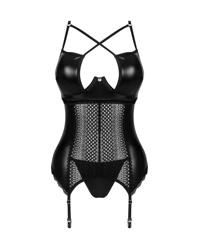 Straps-Corsage und String im schwarzen Set Norides von Obsessive. Im edlen Wetlook, der sich elastisch und weich anschmiegt. Dazu schöne Spitzen-Einsätze und -Details. Bügel-Cups im raffinierten Styling mit Riemchen und extravagantem Ausschnitt. Hinten mit Schnürung, die passend verstellbar ist. Genauso wie die Träger und der Hakenverschluss im tiefen Rückenausschnitt. Auch die Strumpfhalter sind passend verstellbar. Der Wetlook-String verführt mit kleinem Spitzendreieck am Po.