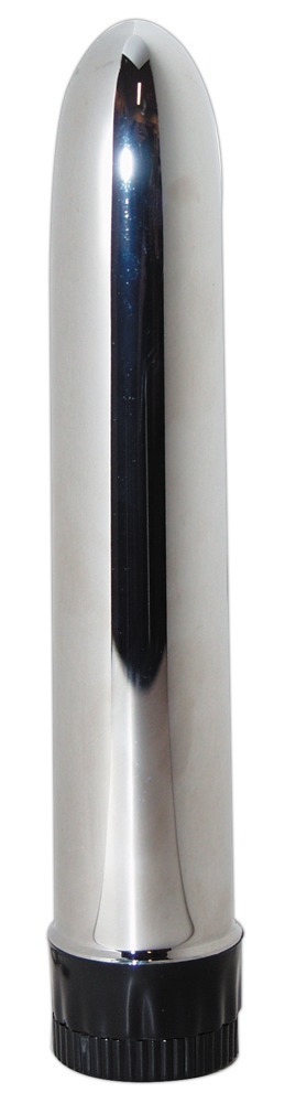 - Silberfarbener, glatter Vibrator (19 cm lang, Ø 3 cm) pur zu genießen oder mit einem der folgenden Aufsätze